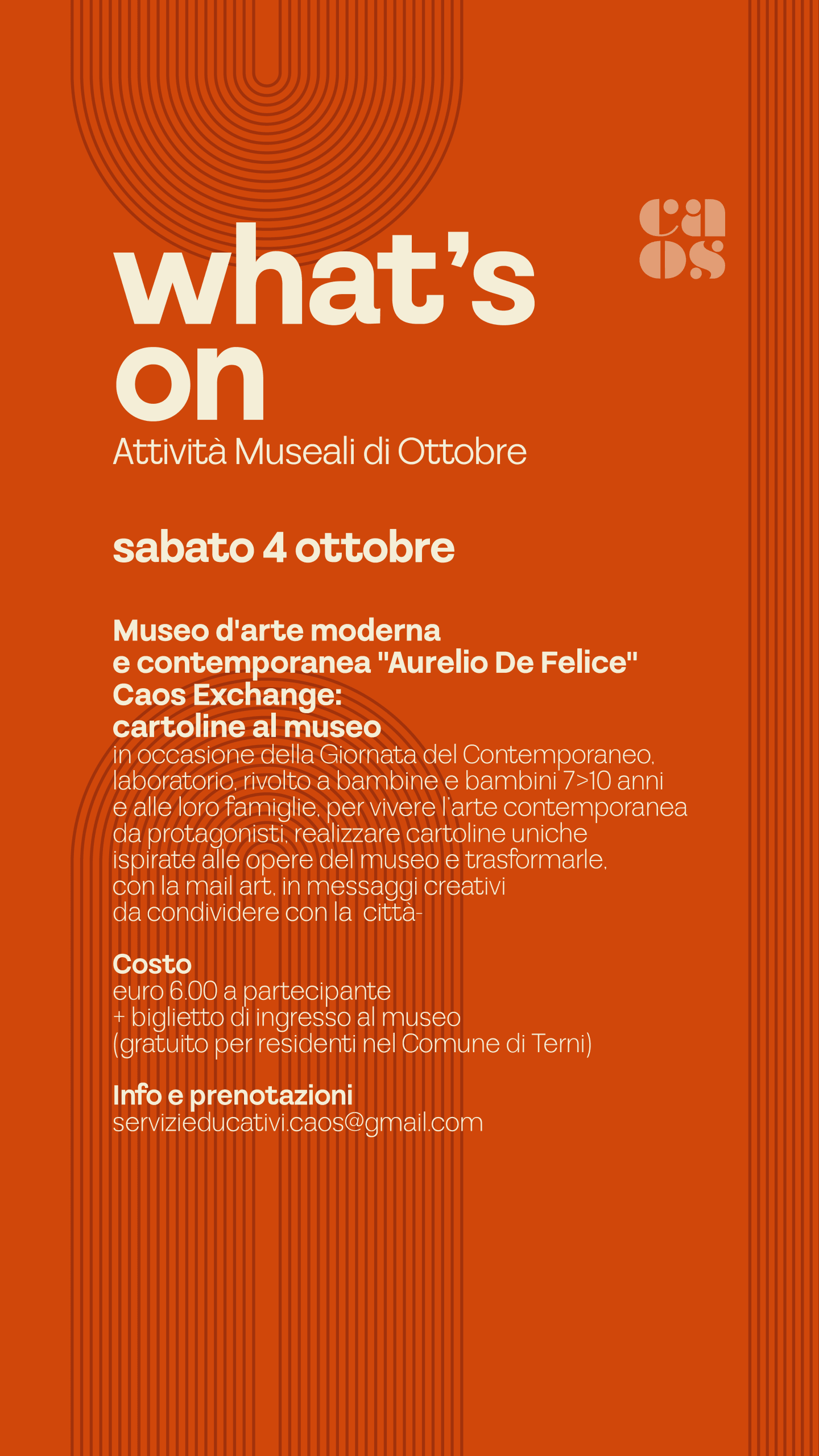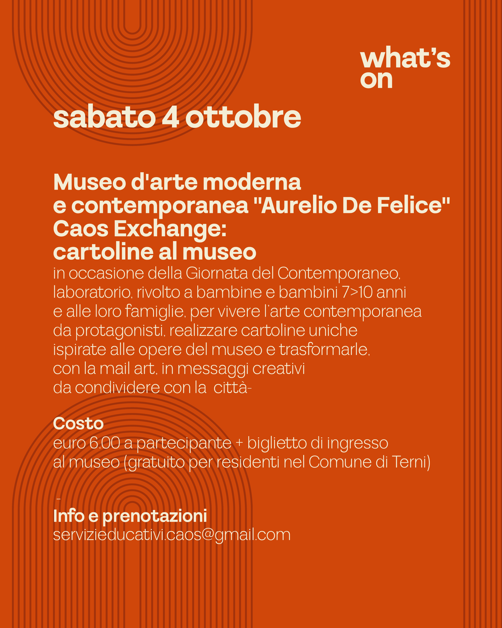in occasione della Giornata del Contemporaneo, laboratorio, rivolto a bambine e bambini 7>10 anni e alle loro famiglie, per vivere l’arte contemporanea da protagonisti, realizzare cartoline uniche ispirate alle opere del museo e trasformarle, con la mail art, in messaggi creativi da condividere con la città